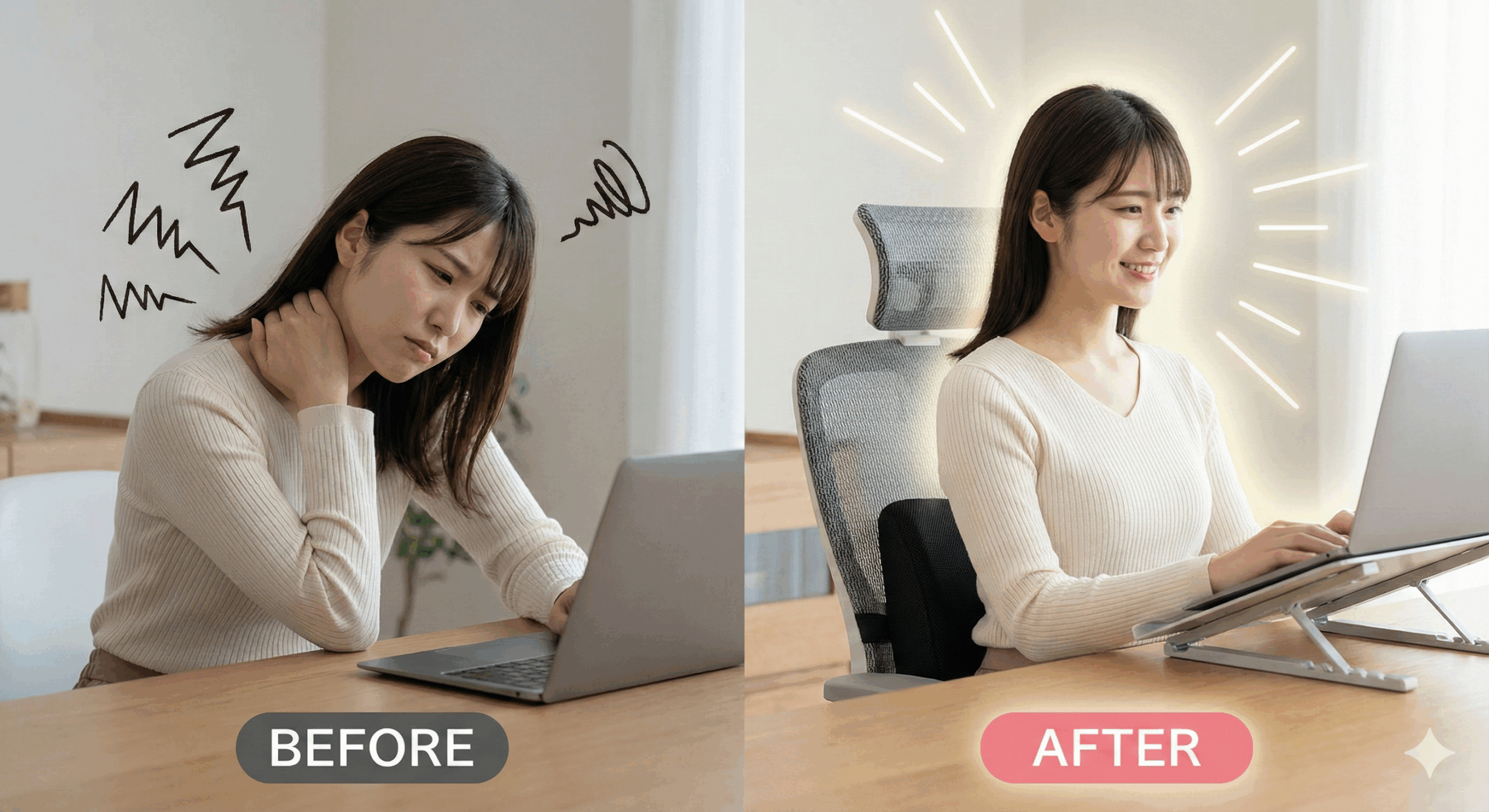 骨盤を立てるクッション、背中を支えるランバーサポート、足を安定させるフットレスト、そして目線を上げるPCスタンド。これらを導入することで、あなたの身体にかかる負担は劇的に分散されます。